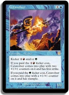 Kicker 1R and/or G If you paid the 1R kicker cost Cetavolver comes into play with two +1/+1 counters on it and has first strike. If you paid the G kicker cost Cetavolver comes into play with a +1/+1 counter on it and has trample.