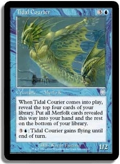 When Tidal Courier comes into play reveal the top four cards of your library. Put all Merfolk cards revealed this way into your hand and the rest on the bottom of your library. 3U: Tidal Courier gains flying until end of turn.