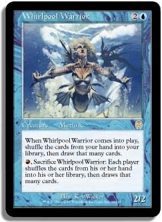 When Whirlpool Warrior comes into play shuffle the cards from your hand into your library then draw that many cards. R Sacrifice Whirlpool Warrior: Each player shuffles the cards from his or her hand into his or her library then draws that many cards.