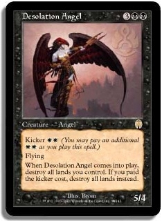 Kicker WW (You may pay an additional WW as you play this spell.) Flying When Desolation Angel comes into play destroy all lands you control. If you paid the kicker cost destroy all lands instead.