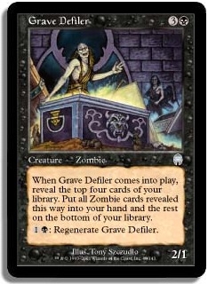 When Grave Defiler comes into play reveal the top four cards of your library. Put all Zombie cards revealed this way into your hand and the rest on the bottom of your library. 1B: Regenerate Grave Defiler.