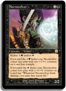 Kicker 1G and/or W If you paid the 1G kicker cost Necravolver comes into play with two +1/+1 counters on it and has trample. If you paid the W kicker cost Necravolver comes into play with a +1/+1 counter on it and has "Whenever Necravolver deals damage you gain that much life."