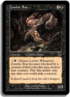 1B: Choose a color. Whenever Zombie Boa becomes blocked by a creature of that color this turn destroy that creature. Play this ability only any time you could play a sorcery.