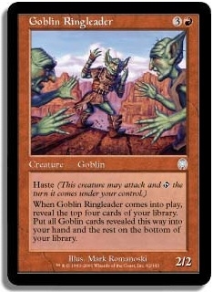 Haste (This creature may attack and T the turn it comes under your control.) When Goblin Ringleader comes into play reveal the top four cards of your library. Put all Goblin cards revealed this way into your hand and the rest on the bottom of your library.