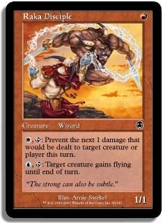 W T: Prevent the next 1 damage that would be dealt to target creature or player this turn. U T: Target creature gains flying until end of turn.