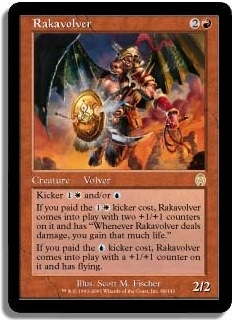 Kicker 1W and/or U If you paid the 1W kicker cost Rakavolver comes into play with two +1/+1 counters on it and has "Whenever Rakavolver deals damage you gain that much life." If you paid the U kicker cost Rakavolver comes into play with a +1/+1 counter on it and has flying.