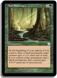 At the beginning of your upkeep if you control a blue or black permanent target creature gets +1/+1 until end of turn. If you control a blue permanent and a black permanent that creature gets +5/+5 until end of turn instead.