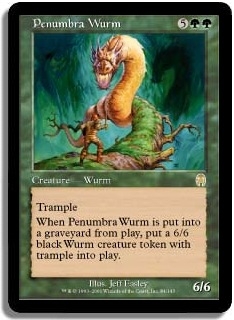 Trample When Penumbra Wurm is put into a graveyard from play put a 6/6 black Wurm creature token with trample into play.