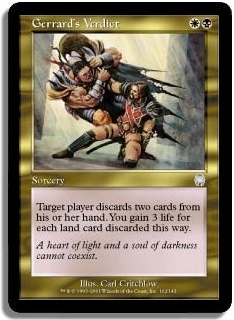 Target player discards two cards from his or her hand. You gain 3 life for each land card discarded this way.