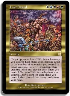 Target opponent loses 2 life for each swamp you control. Last Stand deals damage equal to the number of mountains you control to target creature. Put a 1/1 green Saproling creature token into play for each forest you control. You gain 2 life for each plains you control. Draw a card for each island you control then discard that many cards from your hand.