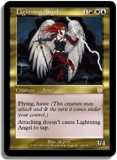 Flying; haste (This creature may attack and T the turn it comes under your control.) Attacking doesn't cause Lightning Angel to tap.