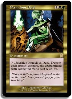 X Sacrifice Pernicious Deed: Destroy each artifact creature and enchantment with converted mana cost X or less.