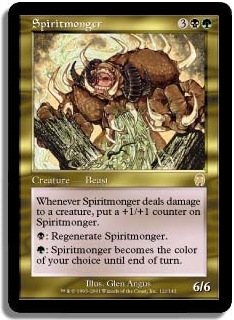 Whenever Spiritmonger deals damage to a creature put a +1/+1 counter on Spiritmonger. B: Regenerate Spiritmonger. G: Spiritmonger becomes the color of your choice until end of turn.