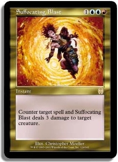 Counter target spell and Suffocating Blast deals 3 damage to target creature.
