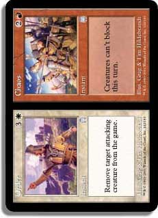 Remove target attacking creature from the game. / Creatures can't block this turn.