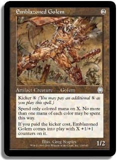 Kicker X (You may pay an additional X as you play this spell.) Spend only colored mana on X. No more than one mana of each color may be spent this way. If you paid the kicker cost Emblazoned Golem comes into play with X +1/+1 counters on it.