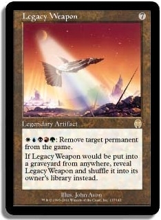 WUBRG: Remove target permanent from the game. If Legacy Weapon would be put into a graveyard from anywhere reveal Legacy Weapon and shuffle it into its owner's library instead.