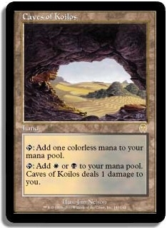 T: Add one colorless mana to your mana pool. T: Add W or B to your mana pool. Caves of Koilos deals 1 damage to you.