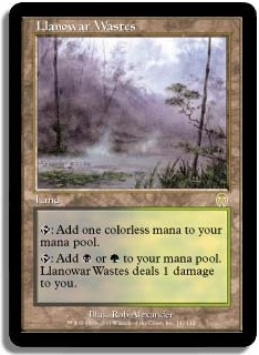 T: Add one colorless mana to your mana pool. T: Add B or G to your mana pool. Llanowar Wastes deals 1 damage to you.