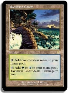 T: Add one colorless mana to your mana pool. T: Add G or U to your mana pool. Yavimaya Coast deals 1 damage to you.