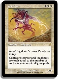 Attacking doesn't cause Cantivore to tap. Cantivore's power and toughness are equal to the number of enchantment cards in all graveyards.