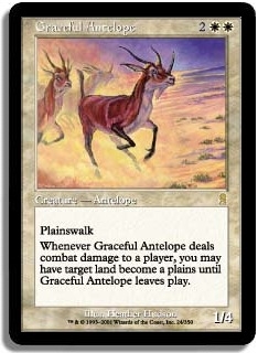 Plainswalk Whenever Graceful Antelope deals combat damage to a player, you may have target land become a plains until Graceful Antelope leaves play.
