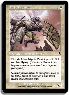 Threshold - Mystic Zealot gets +1/+1 and has flying. (You have threshold as long as seven or more cards are in your graveyard.)
