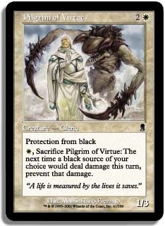 Protection from black W, Sacrifice Pilgrim of Virtue: The next time a black source of your choice would deal damage this turn, prevent that damage.