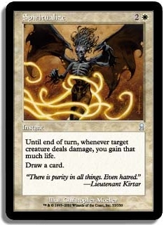 Until end of turn, whenever target creature deals damage, you gain that much life. Draw a card.