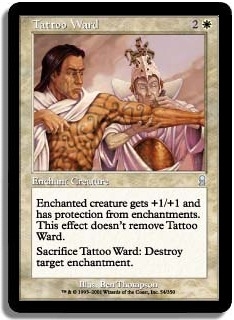 Enchanted creature gets +1/+1 and has protection from enchantments. This effect doesn't remove Tattoo Ward. Sacrifice Tattoo Ward: Destroy target enchantment.