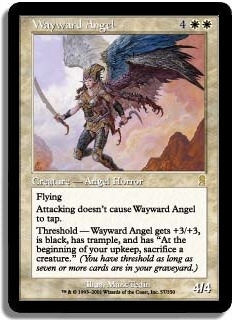 Flying Attacking doesn't cause Wayward Angel to tap. Threshold - Wayward Angel gets +3/+3, is black, has trample, and has At the beginning of your upkeep, sacrifice a creature . (You have threshold as long as seven or more cards are in your graveyard.)