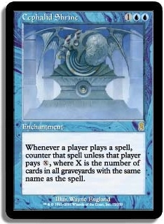 Whenever a player plays a spell, counter that spell unless that player pays X, where X is the number of cards in all graveyards with the same name as the spell.