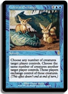 Choose any number of creatures target player controls. Choose the same number of creatures another target player controls. Those players exchange control of those creatures. (This effect doesn't end at end of turn.)