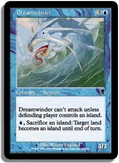 Dreamwinder can't attack unless defending player controls an island. U, Sacrifice an island: Target land becomes an island until end of turn.