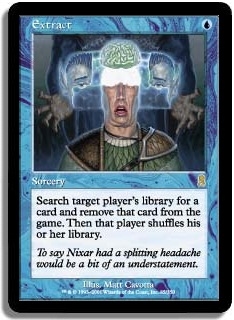 Search target player's library for a card, and remove that card from the game. Then that player shuffles his or her library.