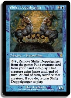 3U, Remove Shifty Doppelganger from the game: Put a creature card from your hand into play. That creature gains haste until end of turn. At end of turn, sacrifice that creature. If you do, return Shifty Doppelganger to play.