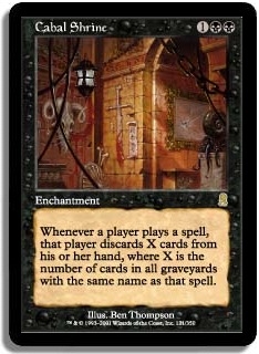 Whenever a player plays a spell, that player discards X cards from his or her hand, where X is the number of cards in all graveyards with the same name as that spell.