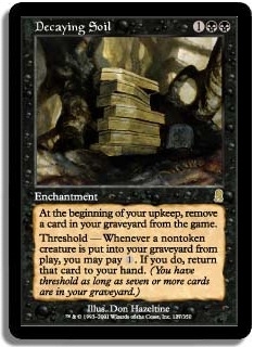 At the beginning of your upkeep, remove a card in your graveyard from the game. Threshold - Whenever a nontoken creature is put into your graveyard from play, you may pay 1. If you do, return that card to your hand. (You have threshold as long as seven