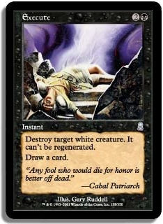 Destroy target white creature. It can't be regenerated. Draw a card.