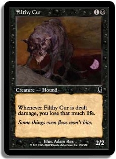 Whenever Filthy Cur is dealt damage, you lose that much life.
