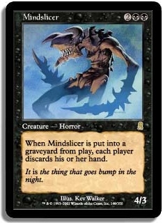 When Mindslicer is put into a graveyard from play, each player discards his or her hand.
