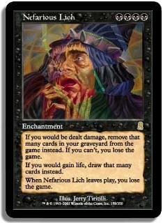 If you would be dealt damage, remove that many cards in your graveyard from the game instead. If you can't, you lose the game. If you would gain life, draw that many cards instead. When Nefarious Lich leaves play, you lose the game.