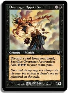 Discard a card from your hand, Sacrifice Overeager Apprentice: Add BBB to your mana pool.