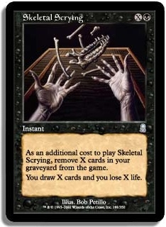 As an additional cost to play Skeletal Scrying, remove X cards in your graveyard from the game. You draw X cards and you lose X life.