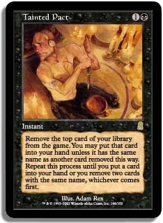 Remove the top card of your library from the game. You may put that card into your hand unless it has the same name as another card removed this way. Repeat this process until you put a card into your hand or you remove two cards with the same name, which