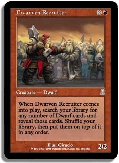 When Dwarven Recruiter comes into play, search your library for any number of Dwarf cards and reveal those cards. Shuffle your library, then put them on top of it in any order.