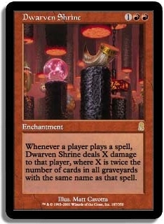 Whenever a player plays a spell, Dwarven Shrine deals X damage to that player, where X is twice the number of cards in all graveyards with the same name as that spell.