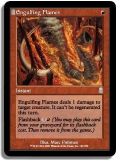 Engulfing Flames deals 1 damage to target creature. It can't be regenerated this turn. Flashback 3R (You may play this card from your graveyard for its flashback cost. Then remove it from the game.)
