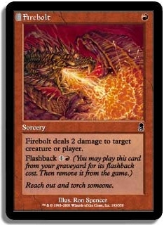 Firebolt deals 2 damage to target creature or player. Flashback 4R (You may play this card from your graveyard for its flashback cost. Then remove it from the game.)