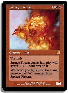 Trample Savage Firecat comes into play with seven +1/+1 counters on it. Whenever you tap a land for mana, remove a +1/+1 counter from Savage Firecat.